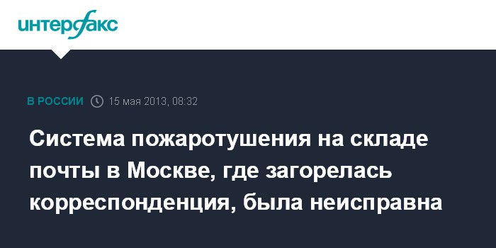 Москва. 15 мая. INTERFAX.RU - Система пожаротушения на складе "Почты России" в Москве, где в понедельник днем произошел пожар, была неисправна, сообщил "Интерфаксу" источник в правоохранительных органах.