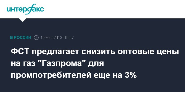 Москва. 15 мая. INTERFAX.RU - Федеральная служба по тарифам (ФСТ) России предлагает снизить оптовые цены на газ "Газпрома" для промпотребителей с 1 июля еще на 3%.