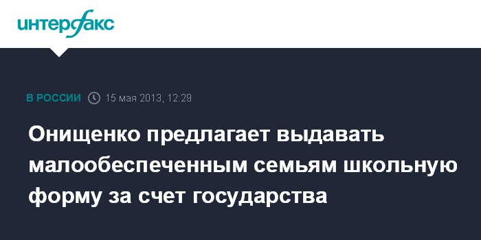 Москва. 15 мая. INTERFAX.RU - Руководитель Роспотребнадзора, главный государственный санитарный врач РФ Геннадий Онищенко выступает за введение в стране обязательной школьной формы, но предлагает выдавать ее малообеспеченным семьям бесплатно.