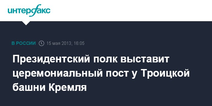 Москва. 15 мая. INTERFAX.RU - Церемониальный пост Президентского полка будет организован у Троицкой башни московского Кремля в рамках празднования 77-ой годовщины образования этого воинского подразделения, сообщили в ФСО РФ.
