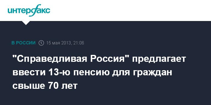 "Мы вносим предложение: тем пенсионерам, которые достигли 70-летнего возраста, платить 13-ю пенсию. Мы посчитали, это 10,5 млн пенсионеров. Цена вопроса немаленькая, но и не такая уж смертельная - 120 млрд рублей", - сказал С.Миронов в среду, добавив, что просит у президента поддержки для принятия данной инициативы.