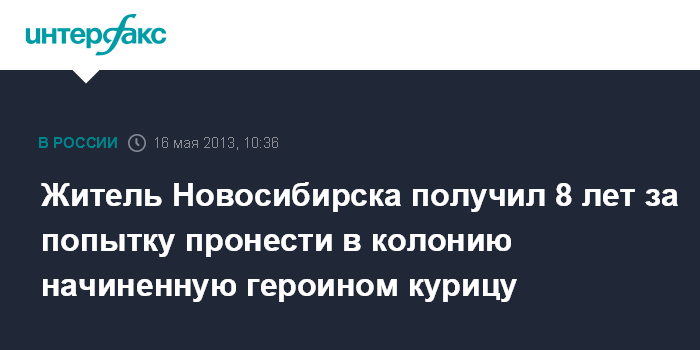 "Судом установлено, что в ноябре 2012 года Никулин незаконно приобрел героин массой более 15,5 г. Указанное наркотическое средство он упаковал в восемь полимерных свертков, которые поместил в тушку курицы", - говорится в сообщении. Никулин с начиненной героином курицей был задержан 17 ноября сотрудниками исправительной колонии №2 ГУФСИН России по Новосибирской области.