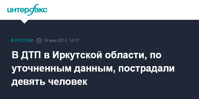 Иркутск. 16 мая. INTERFAX.RU - По уточненным данным, с места ДТП в Иркутской области, где в четверг на федеральной трассе М-53 пассажирский автобус столкнулся с грузовым автомобилем, госпитализированы девять человек.