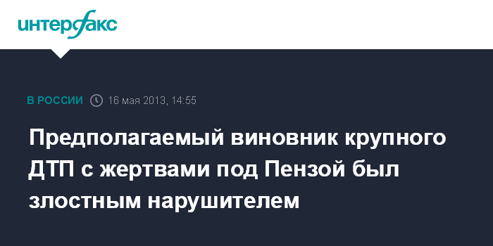 14 мая на трассе Пенза - Тамбов в районе села Константиновка Пензенского района столкнулись три автомобиля. По предварительным данным, водитель микроавтобуса Volkswagen выехал на полосу дороги, предназначенную для встречного движения, где столкнулся с грузовиком и Chevrolet Lacetti. В ДТП погибли 10 человек, в том числе водитель микроавтобуса, еще девять были доставлены в больницу.