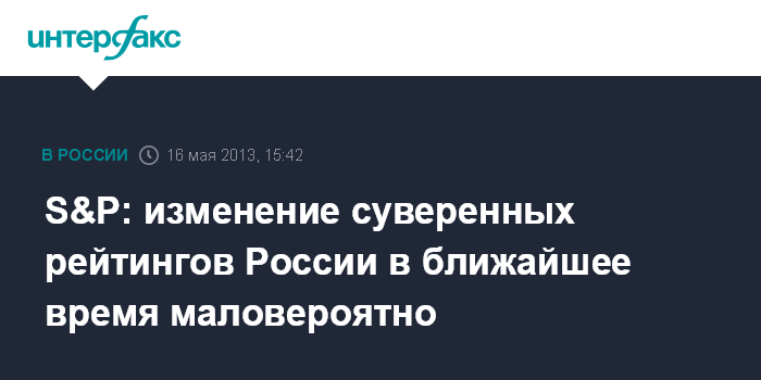Лондон. 16 мая. INTERFAX.RU - Изменение суверенных рейтингов РФ в ближайшее время маловероятно, несмотря на ожидающееся замедление роста экономики страны до 3% в 2013 г. по сравнению с 3,4% в 2012 г., сообщается в докладе международного рейтингового агентства Standard & Poor's.