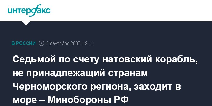 Москва. 3 сентября. ИНТЕРФАКС-АВН - Уже седьмой по счету корабль ВМС НАТО, не принадлежащий странам региона, прибывает в Черное море, сообщили "Интерфаксу-АВН" в среду в российском военном ведомстве.