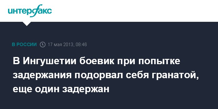Назрань. 17 мая. INTERFAX.RU - В станице Орджоникидзевской Сунженского района Ингушетии во время задержания полицейскими подозреваемый в участии в бандформированиях подорвал себя гранатой, еще один подозреваемый задержан, сообщили в пятницу агентству "Интефакс" в МВД республики.