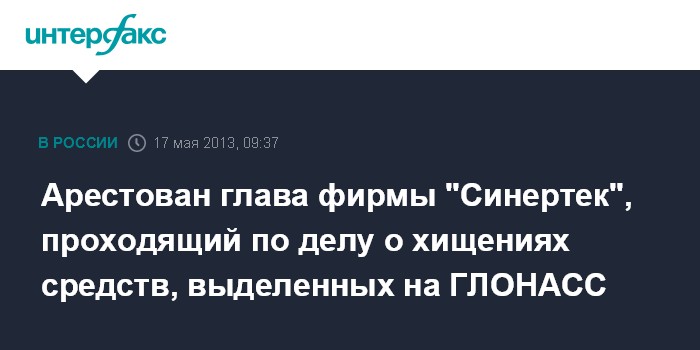 Москва. 17 мая. INTERFAX.RU - Глава фирмы "Синертек", ставший фигурантом дела о хищении средств, выделенных на развитие системы ГЛОНАСС, арестован, бывший глава той же компании заключен под домашний арест, сообщили "Интерфаксу" в пресс-службе ГУ МВД России по Москве.