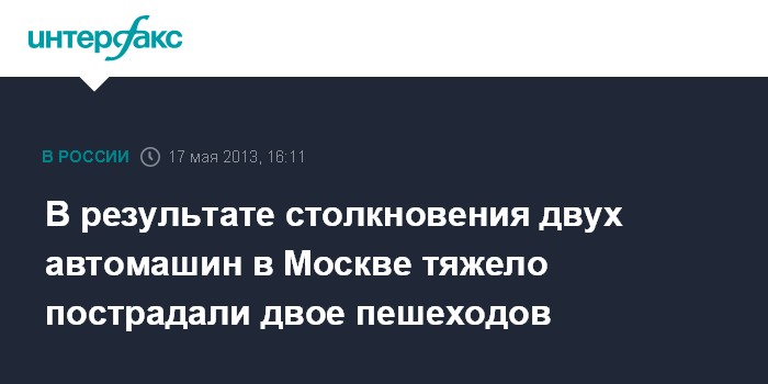 Москва. 17 мая. INTERFAX.RU - Два пешехода получили тяжелые травмы после того, как их сбили машины, попавшие в ДТП в центре столицы, сообщил "Интерфаксу" источник в правоохранительных органах