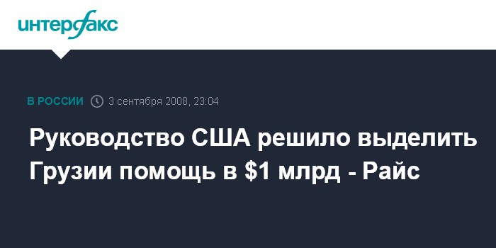 Вашингтон. 3 сентября. ИНТЕРФАКС - Госсекретарь США Кондолиза Райс объявила в среду о решении выделить Грузии помощь размером в $1 млрд.