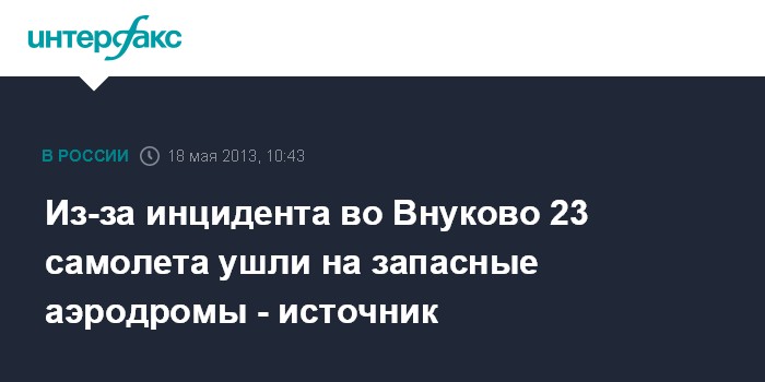 Москва. 18 мая. INTERFAX.RU - Свыше 20 самолетов ушли на запасные аэродромы после инцидента с "Боингом" ЮТэйр во аэропорту Внуково, сообщил "Интерфаксу" источник в администрации аэропорта. "В общей сложности в период, пока аэропорт был временно закрыт, на запасные аэродромы ушли 23 самолета, в том числе 20 в Домодедово, два - в Ярославль и один - в Нижний Новгород", - отметил источник.