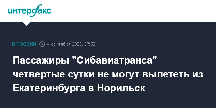 Екатеринбург. 4 сентября. ИНТЕРФАКС-УРАЛ - Пассажиры авиакомпании "Сибавиатранс" (входит в альянс AiRUnion), купившие билеты на рейс из Екатеринбурга в Норильск, четвертые сутки не могут вылететь из международного аэропорта "Кольцово" (Екатеринбург).