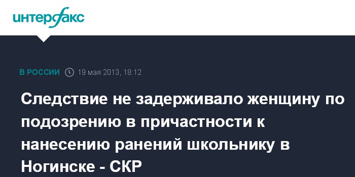 Москва. 19 мая. INTERFAX.RU - Следствие не задерживало женщину по подозрению в причастности к нанесению тяжких телесных повреждений школьнику в подмосковном Ногинске, сообщила "Интерфаксу" официальный представитель ГСУ СК РФ по Московской области Ирина Гуменная. Ранее сообщалось, что в Подмосковье задержана женщина, подозреваемая в нанесении тяжелого ранения 15-летнему подростку.