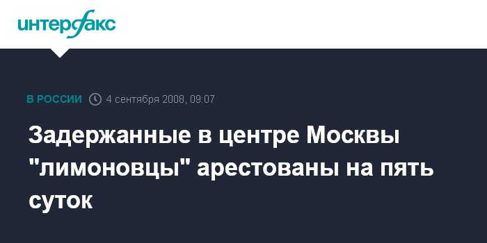 Москва. 4 сентября. INTERFAX.RU - Пресненский суд Москвы назначил двоим "лимоновцам" по пять суток административного ареста за акцию протеста у Белого дома, сообщают в коалиции "Другая Россия".