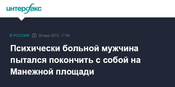 Москва. 20 мая. INTERFAX.RU - Психически нездоровый мужчина угрожал покончить с собой, забравшись на статую на Манежной площади в центре столицы, сообщил "Интерфаксу" в понедельник источник в медицинских кругах столицы.