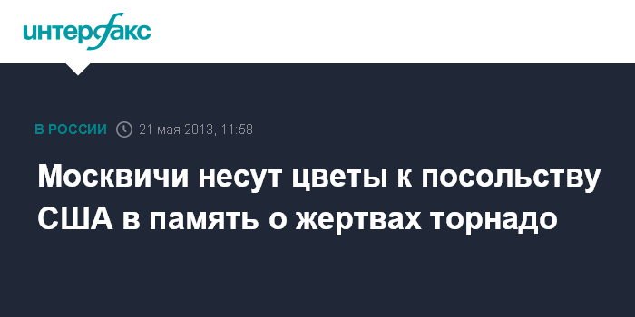 Москва. 21 мая. INTERFAX.RU - Москвичи приносят цветы к посольству США, чтобы выразить солидарность со скорбящим американским народом в связи с торнадо в Оклахоме