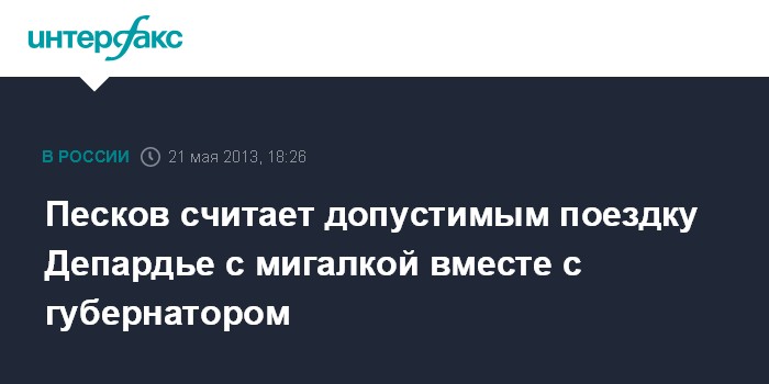 Сочи. 21 мая. INTERFAX.RU - Пресс-секретарь президента Дмитрий Песков считает допустимым передвижение известного актера Жерара Депардье на машине с "мигалкой" в случае, если он ездит вместе с губернатором.