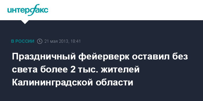 Калининград. 21 мая. INTERFAX.RU - ОАО "Янтарьэнерго" требует возмещения ущерба от фейерверка, который стал причиной серьезных повреждений элекросетевого комплекса Калининградской области.