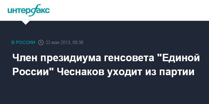 Москва. 22 мая. INTERFAX.RU - Член президиума генсовета "Единой России" (ЕР) Алексей Чеснаков написал заявление о выходе из партии власти, сообщил сам Чесноков в интервью, которое в среду публикует газета "Коммерсант".