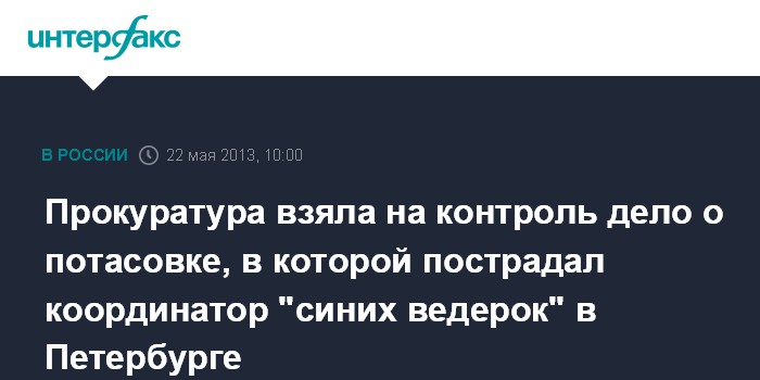 Санкт-Петербург. 22 мая. INTERFAX.RU - Прокуратура Колпинского района Петербурга поставила на контроль ход расследования дела о потасовке, в которой получил травмы координатор движения "Синие ведерки" в северной столице Георгий Кокорин.