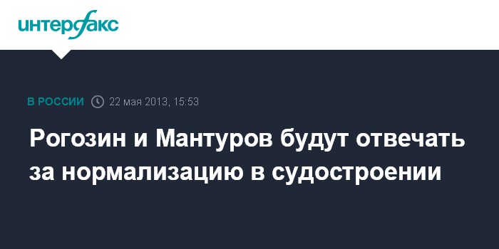 Москва. 22 мая. INTERFAX.RU - Ответственными за нормализацию ситуации в судостроении президент РФ Владимир Путин назначил вице-премьера Дмитрия Рогозина и главу Минпромторга Дениса Мантурова, сообщил пресс-секретарь главы государства Дмитрий Песков.