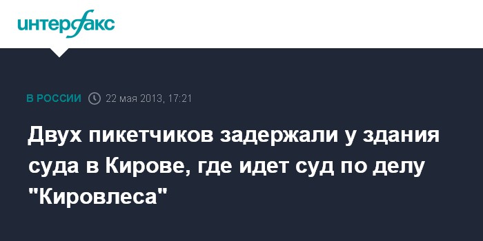 Киров. 22 мая. INTERFAX.RU - Сотрудники полиции задержали в среду в Кирове двух человек, пытавшихся запустить на воздушных шариках плакат с высказываниями против власти у Ленинского районного суда, где проходит процесс по делу "Кировлеса".