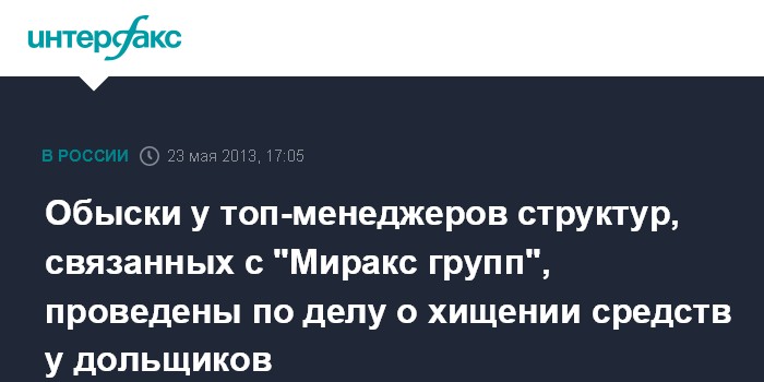 Москва. 23 мая. INTERFAX.RU - В МВД РФ подтвердили, что у бывших и нынешних топ-менеджеров компаний, связанных с "Миракс групп", проведены обыски по заявлению участников долевого строительства, сообщили "Интерфаксу" в пресс-центре ведомства.