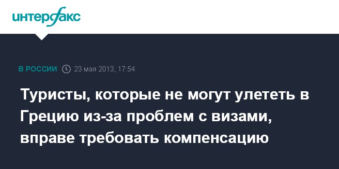 Москва. 23 мая. INTERFAX.RU - Туристы, которые не могут в четверг улететь в Грецию из-за проблем с оформлением виз, вправе требовать компенсацию, сообщила "Интерфаксу" пресс-секретарь Ростуризма Ирина Щеголькова.