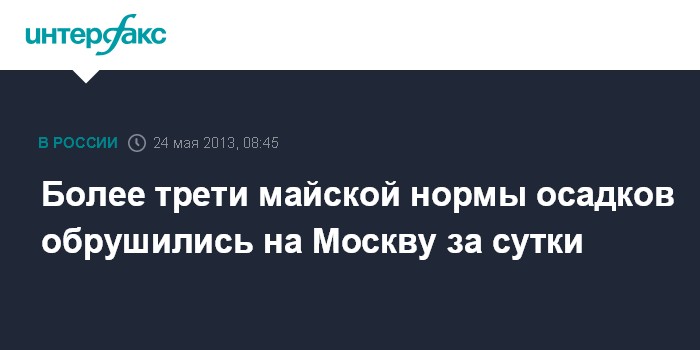Москва. 24 мая. INTERFAX.RU - За последние сутки в столице выпало около 18 мм осадков при норме для мая 51 мм, сообщили "Интерфаксу" в Гидрометеобюро Москвы и Московской области. Всего за последние двое суток выпало 26 мм осадков, то есть чуть более половины нормы за месяц.