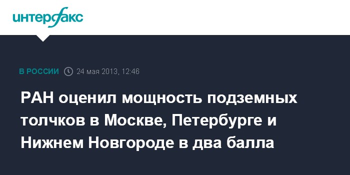Москва. 24 мая. INTERFAX.RU - Мощность подземных толчков в Москве, Петербурге и Нижнем Новгороде составила 2 балла, сообщил Институт физики Земли имени Шмидта РАН.