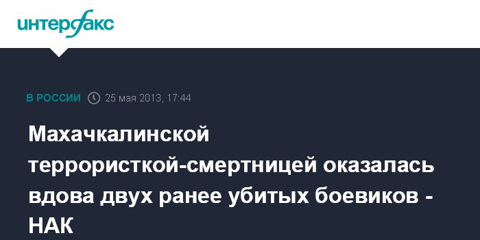Москва. 25 мая. INTERFAX.RU - Террористка-смертница, совершившая в субботу самоподрыв в Махачкале, предварительно опознана как 25-летняя Мадина Алиева, сообщил Национальный антитеррористический комитет. "Она являлась гражданской женой двух нейтрализованных ранее боевиков Алиева и Джапаева", - говорится в поступившем в "Интерфакс" сообщении НАК.