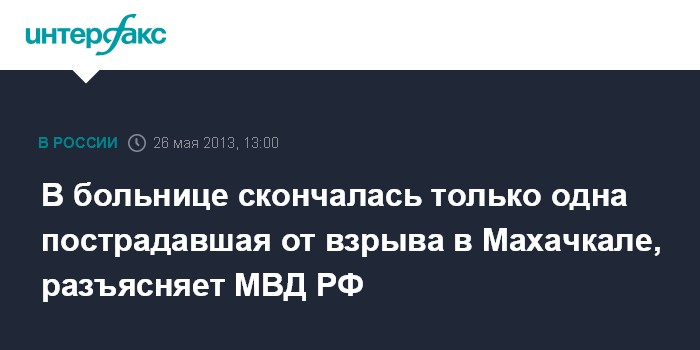 Москва. 26 мая. INTERFAX.RU - МВД РФ вновь уточняет информацию о погибших в результате взрыва у здания МВД Дагестана в Махачкале: среди мирного населения есть только одна жертва.