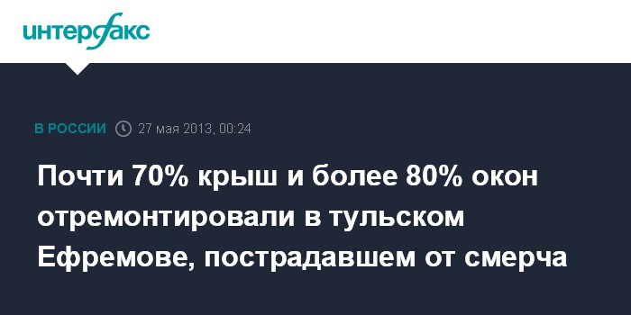 Тула. 27 мая. ИНТЕРФАКС-ЦЕНТР - В городе Ефремов Тульской области, серьезно пострадавшем на этой неделе в результате смерча, подходят к завершению восстановительные работы.