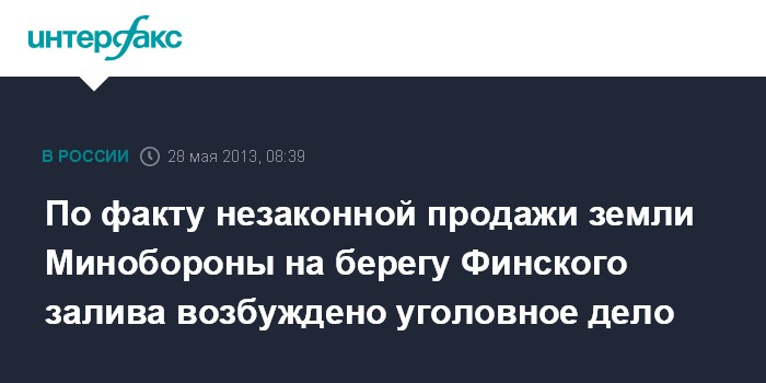 Москва. 28 мая. INTERFAX.RU - Уголовное дело по ст. 286 УК РФ ("Превышение должностных полномочий") возбуждено в связи с продажей по заниженной в два раза цене участка в 11 тыс. кв. м и строений Минобороны на берегу Финского залива, сообщает газета "Известия" во вторник.