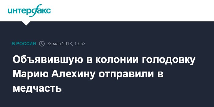 Пермь. 28 мая. INERFAX.RU - По данным сторонников панк-группы Pussy Riot, Мария Алехина, объявившая голодовку в колонии, находится в медицинской части исправительного учреждения.
