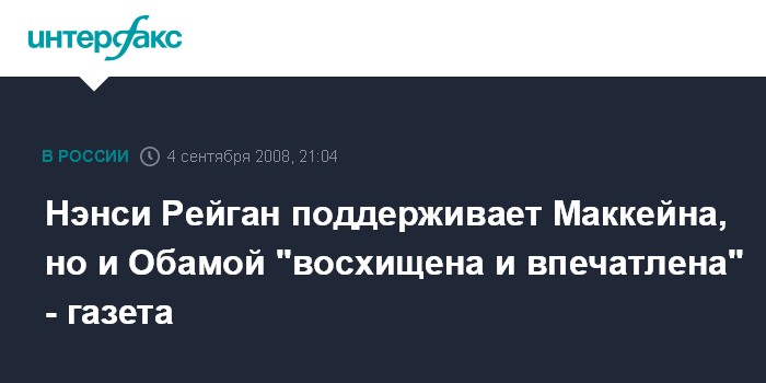Нэнси Рейган поддерживает Маккейна, но и Обамой "восхищена и впечатлена" - газета