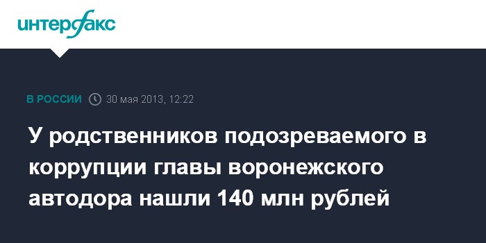 Москва. 30 мая. INTERFAX.RU - У родственников руководителя управления автомобильных дорог и дорожной деятельности правительства Воронежской области Александра Трубникова, который подозревается в получении взятки, обнаружена крупная сумма денег, хранившаяся в мешках и коробках, сообщили "Интерфаксу" в четверг в пресс-центре МВД РФ.