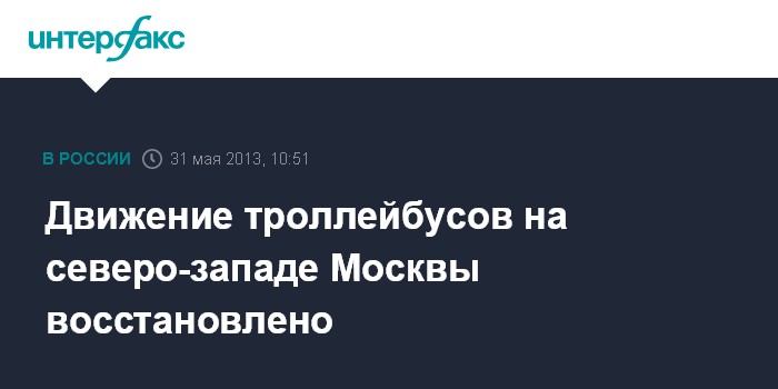 Москва. 31 мая. INTERFAX.RU - Движение троллейбусов на Живописной улице в Северо-Западном административном округе города после аварии восстановлено, сообщили в пресс-службе столичного департамента транспорта и развития дорожно-транспортной сети.