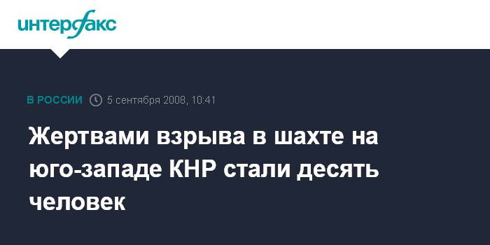 Москва. 5 сентября. INTERFAX.RU - В результате взрыва метана на угольной шахте в юго-западной китайской провинции Сычуань погибли 10 человек, восемь человек считаются пропавшими без вести, сообщают китайские СМИ со ссылкой на спасателей.