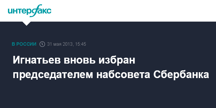 Москва. 31 мая. INTERFAX.RU - Глава ЦБ РФ Сергей Игнатьев вновь избран председателем наблюдательного совета Сбербанка России, сообщил журналистам президент - председатель правления Сбербанка Герман Греф по итогам годового общего собрания акционеров.