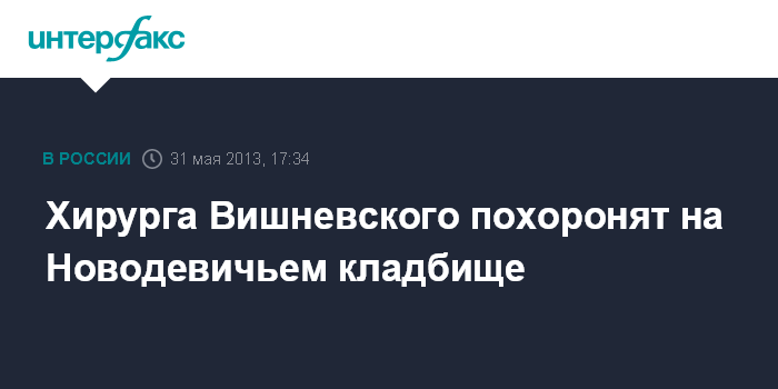 "Прощание с Александром Александровичем Вишневским состоится 4 июня в 10:30 в конференц-зале Института хирургии им. А.В. Вишневского. Александр Александрович будет похоронен на Новодевичьем кладбище", - говорится в сообщении Института Вишневского, поступившем в "Интерфакс".