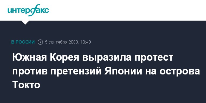 "Правительство Республики Корея выражает протест против характеристики островов Токто как японских, содержащейся в изданной 5 сентября Белой книге по вопросам обороны", - сказал представитель МИД Южной Кореи Мун Дэ Йон.
