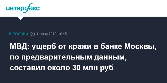 МВД: ущерб от кражи в банке Москвы, по предварительным данным, составил около 30 млн руб