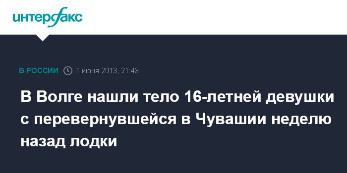 Чебоксары. 1 июня. ИНТЕРАКС-ПОВОЛЖЬЕ - Обнаружено тело 16-летней пассажирки лодки, перевернувшейся в Чувашии неделю назад, сообщил агентству "Интерфакс-Поволжье" старший помощник руководителя СУ СКР по республике Олег Дмитриев.