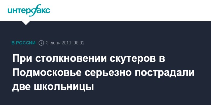 Москва. 3 июня. INTERFAX.RU - Две школьницы получили тяжелейшие травмы, столкнувшись поздно вечером на скутерах в Московской области, сообщили "Интерфаксу" в пресс-службе ГУ МВД России по региону.