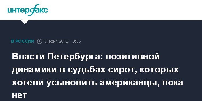 Санкт-Петербург. 3 июня. INTERFAX.RU - Более 30 сирот из Петербурга, которые не успели уехать в Соединенные Штаты Америки к своим новым приемным родителям из-за вступления в силу соответствующего закона, пока по-прежнему остаются в социальных учреждениях.