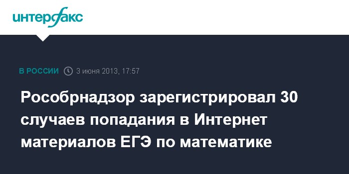Москва. 3 июня. INTERFAX.RU - В Рособнадзоре заявили, что всего в ходе проведения экзамена было зарегистрировано 30 случаев выкладывания в Интернет примеров экзаменационных заданий. Чаще других выкладывали в Интернет фрагменты заданий ЕГЭ по математике выпускники в Башкирии.