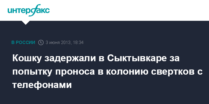 Сыктывкар. 3 июня. INTERFAX.RU - Сотрудники ГУФСИН Коми задержали кошку при попытке доставки в исправительную колонию №1 Сыктывкара запрещенных к хранению и использованию осужденными предметов, сообщает пресс-служба регионального ведомства в понедельник.