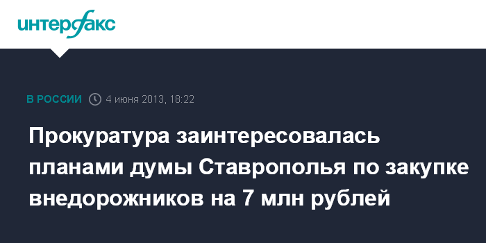 Москва. 4 июня. INTERFAX.RU - Прокуратура Ставропольского края проводит проверку по факту размещения краевой думой заказа на поставку дорогостоящих внедорожников, сообщает пресс-служба надзорного ведомства во вторник.