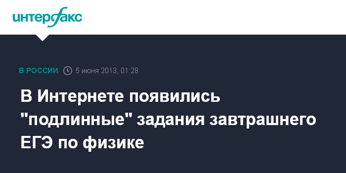 Москва. 5 июня. INTERFAX.RU - Предположительно подлинные задания Единого государственного экзамена по физике, который пройдет по всей России 6 июня, появились в свободном доступе в Интернете вечером во вторник.
